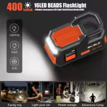 The auto battery jump box integrates a high-output 400-lumen LED flashlight with three light modes - lighting, flashing and emergency SOS.