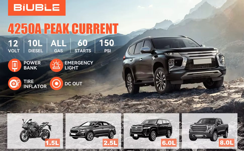 An all-new powerful jump starter rated at 4250-amps peak current to start your vehicle up to All gas or 10L diesel engine) up to 60 times. JS006 battery booster can reliably start all 12V dead batteries easily and safely in 1-3 seconds. Safe in extreme temperatures of -20℃~60℃, so no more worrying about exhausted car battery in cold Winter and storage in hot Summer.